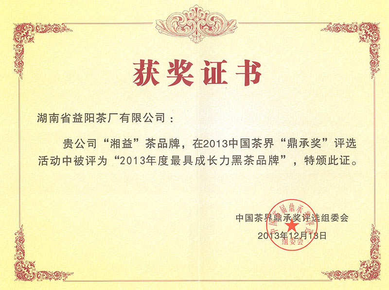 中國最具成長力黑茶品牌(鼎承獎)