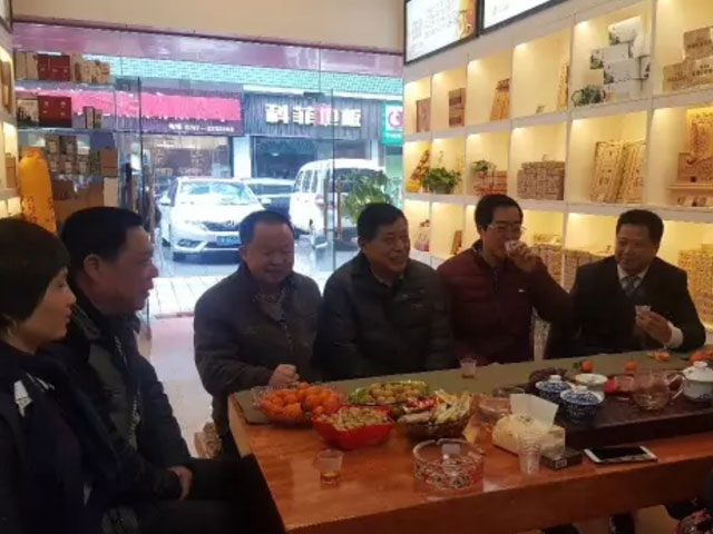 圖為政協(xié)安化縣委員會(huì)原主席、安化縣茶業(yè)協(xié)會(huì)會(huì)長(zhǎng)李俊夫(右三)、益陽(yáng)市茶葉局副局長(zhǎng)龔巨成(左二)、安化縣茶業(yè)協(xié)會(huì)秘書長(zhǎng)曾學(xué)軍(左三)在公司常務(wù)副總經(jīng)理徐迪軍(右二)、國(guó)家非遺代表性傳承人劉杏益的陪同下(左四)品飲湘益茯茶。