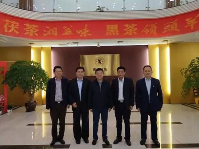 湖南省副省長陳飛(右三)、益陽市副市長毛知兵(左一)、赫山區(qū)委副書記、區(qū)長馬文才(右一)、益陽茶廠有限公司董事長彭雄根(右二)、總經(jīng)理陳小春(左二)合影