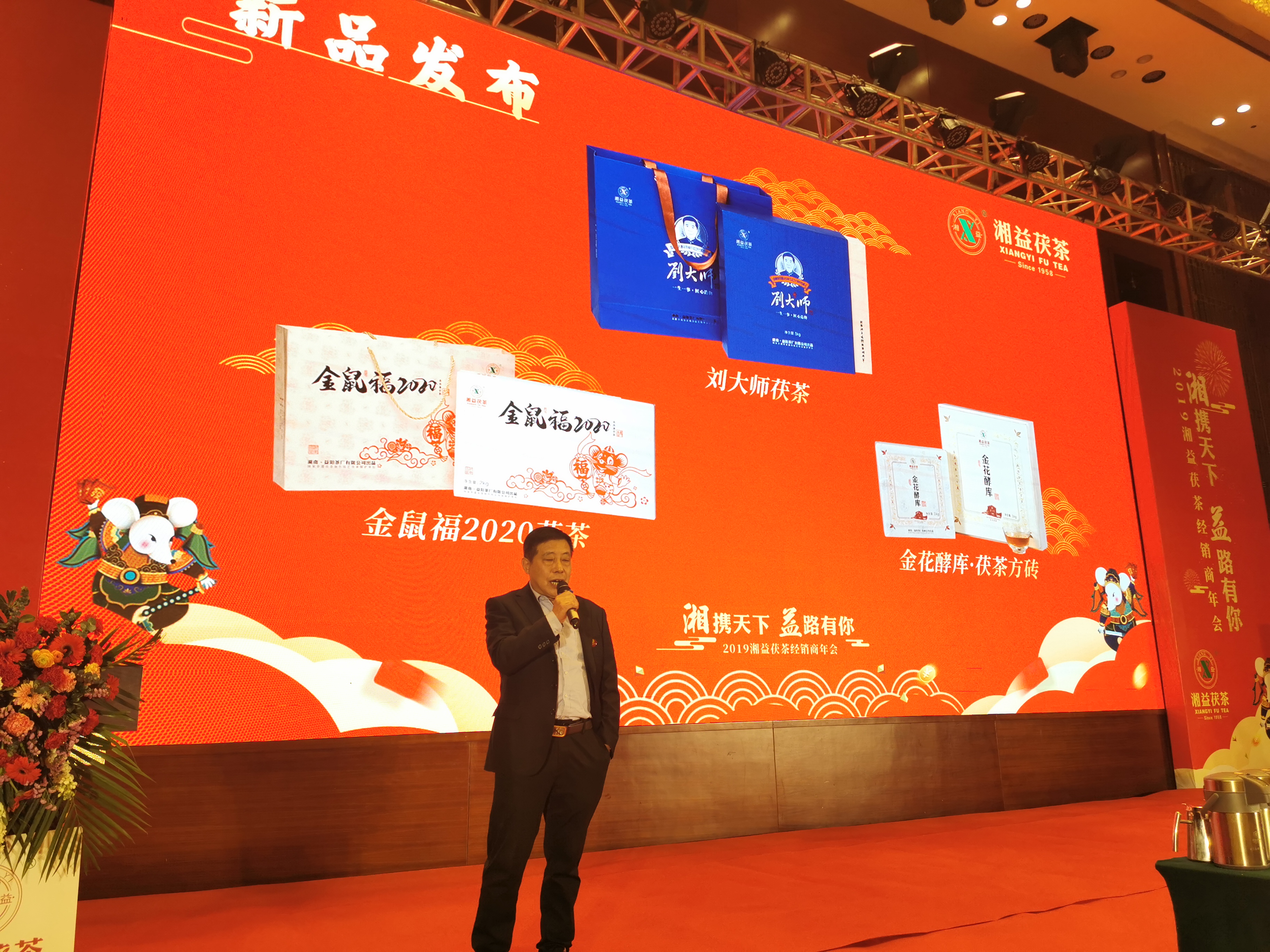 在下午的年會中,先是年度新品發(fā)布,由茯茶國家非遺制作技藝國家級傳承人、中國第一批制茶大師,公司副總經(jīng)理劉杏益大師做新品推介,有劉大師茯茶、金花酵庫方磚、金鼠福生肖茶、7319茯茶,這四款新品都傾注了湘益茶人的心血,得到了到場來賓的高度贊賞。