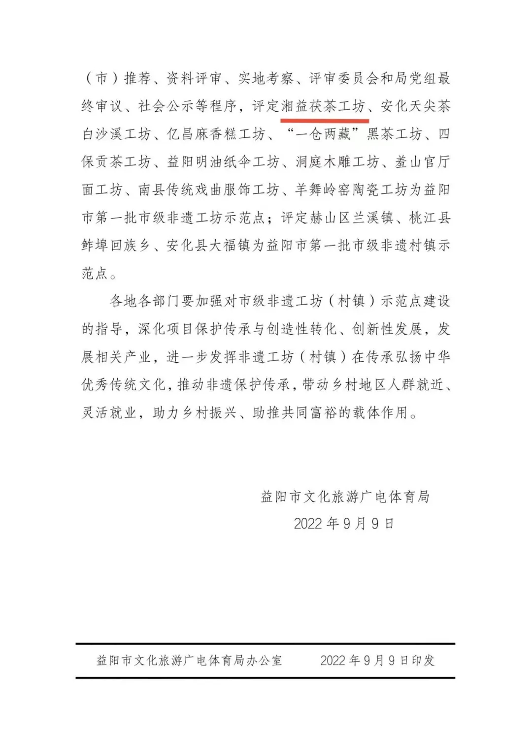 為深入貫徹中共中央辦公廳、國務(wù)院辦公廳《關(guān)于進(jìn)一步加強(qiáng)非物質(zhì)文化遺產(chǎn)保護(hù)工作的意見》有關(guān)精神,市文化旅游廣電體育局在全市開展非遺工坊、非遺村鎮(zhèn)、非遺街區(qū)示范點(diǎn)建設(shè)工作,經(jīng)區(qū)縣(市)推薦、資料評(píng)審、實(shí)地考察、評(píng)審委員會(huì)和局黨組最終審議、社會(huì)公示等程序,評(píng)定湘益茯茶工坊、安化天尖茶白沙溪工坊、億昌麻香糕工坊、“一倉兩藏”黑茶工坊、四保貢茶工坊、益陽明油紙傘工坊、洞庭木雕工坊、羞山官廳面工坊、南縣傳統(tǒng)戲曲服飾工坊、羊舞嶺窯陶瓷工坊為益陽市第一批市級(jí)非遺工坊示范點(diǎn);評(píng)定赫山區(qū)蘭溪鎮(zhèn)、桃江縣鲊埠回族鄉(xiāng)、安化縣大福鎮(zhèn)為益陽市第一批市級(jí)非遺村鎮(zhèn)示范點(diǎn)。