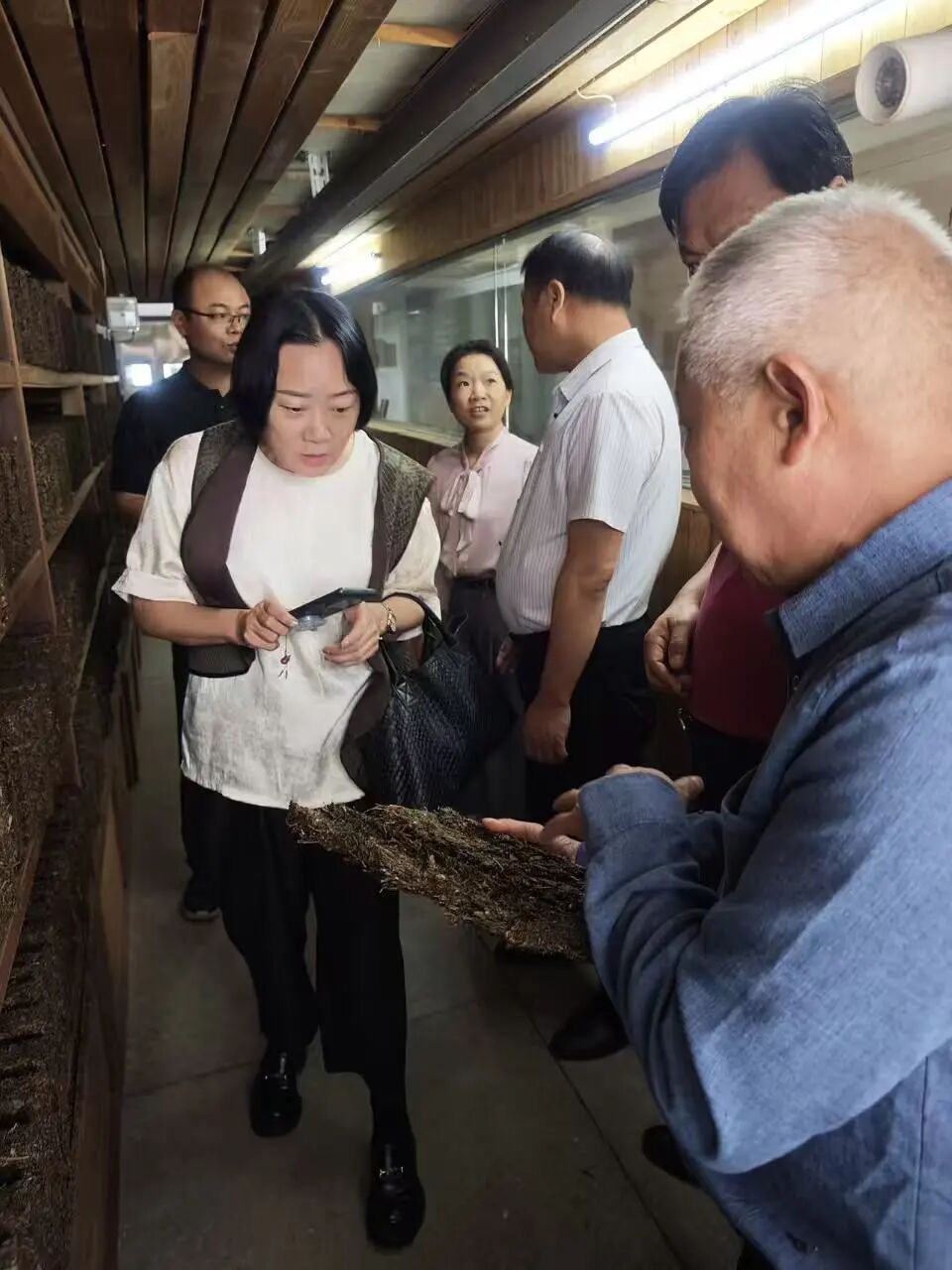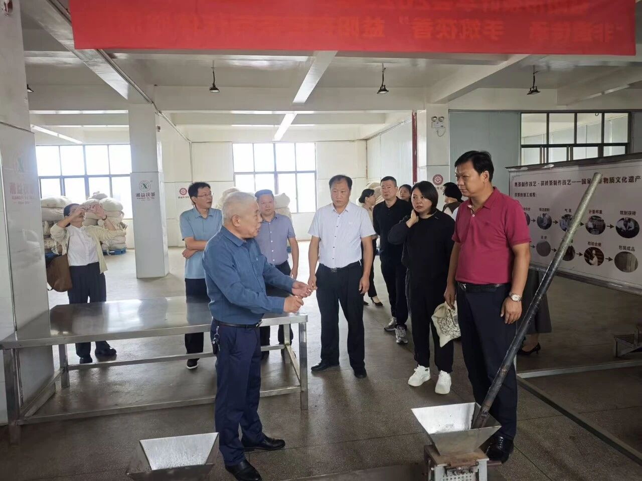 在公司總經理余智勇,黨委書記、常務副總經理徐迪軍,首席專家、茯磚茶制作技藝國家級非遺傳承人劉杏益等的陪同下,調研組實地考察了生產車間、湘益茶博館。在生產一線,調研組細致察看了茯磚茶的傳統(tǒng)制作工藝流程;在茶博館,深入了解了茯茶深厚的歷史底蘊與企業(yè)發(fā)展歷程。