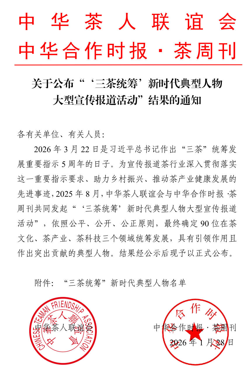 近日,由中華茶人聯(lián)誼會(huì)與中華合作時(shí)報(bào)·茶周刊共同主辦的 “‘三茶統(tǒng)籌’新時(shí)代典型人物大型宣傳報(bào)道活動(dòng)” 評(píng)選結(jié)果正式揭曉。公司總經(jīng)理余智勇,憑借其在推動(dòng)茯茶產(chǎn)業(yè)高質(zhì)量發(fā)展、深入踐行“三茶統(tǒng)籌”發(fā)展理念方面的突出貢獻(xiàn),光榮入選。