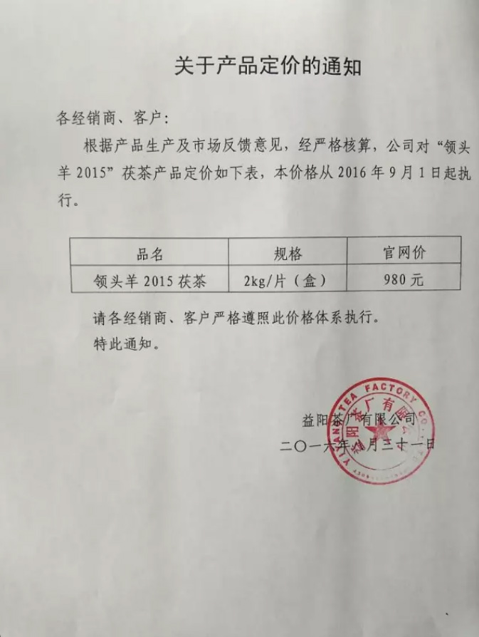 根據(jù)產(chǎn)品生產(chǎn)及市場(chǎng)反饋意見(jiàn),經(jīng)嚴(yán)格核算,公司對(duì)“領(lǐng)頭羊2015”茯茶產(chǎn)品定價(jià)如下表,本價(jià)格從2016年9月1日起執(zhí)行。